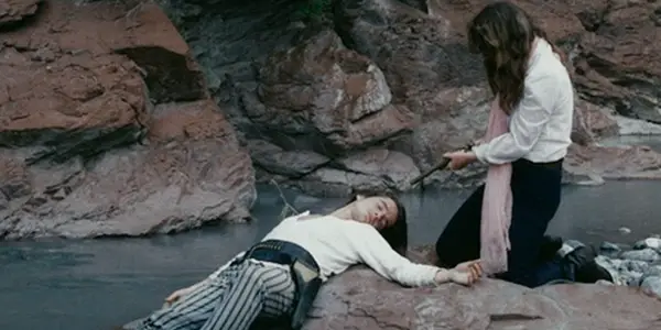 Scrawny, scraggly, and clad in a pair of striped pants that look like they were stolen from a dandy’s pajamas, Léaud’s Billy is on the run after a robbery when he encounters Ann (Rachel Kesterber), a beautiful woman lying half-buried in the sand of the desert. After he decides to drag her along with him so she cannot tell the authorities where he and his loot are hiding, they embark on a dangerous quest across rocky hills and wild rivers. (The film was shot in the Hautes-Alpes region of France, where the ruggedly beautiful terrain masquerades as a slightly off, fittingly surreal version of the American West.)
