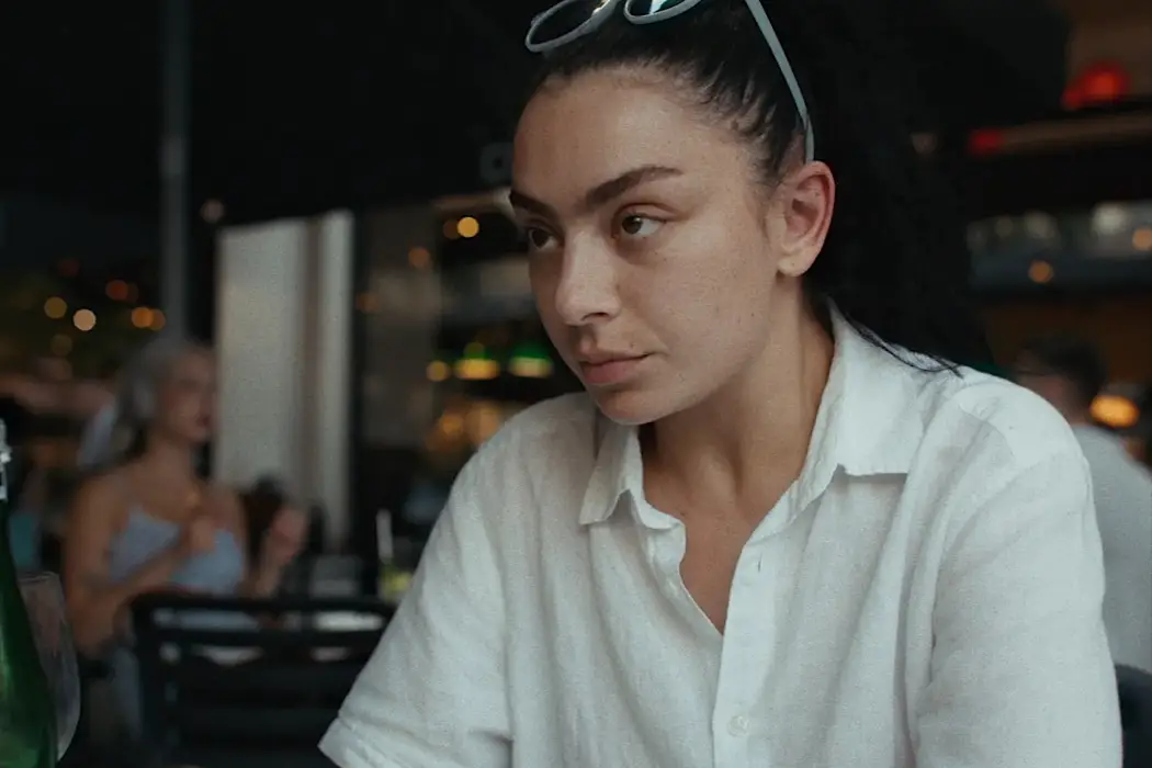 Ohs regularly collaborates with his lead actors on the scripts for his films; Erupcja is no different, with Charli xcx, Will Madden, Lena Góra, and Jeremy O. Harris all credited as co-writers. The result, a few painfully awkward and obvious lines of dialogue aside, feels remarkably real and leads to wonderfully natural performances from the ensemble cast. Charli xcx thrives playing against type and has great chemistry with Góra, who, of everyone on screen, feels like the one you’d most want to have as a friend. Madden adds layers of depth to a character that could have existed merely to be mocked—his scenes towards the end, when he connects with Nel, are some of the best in the film—while Harris observes all the shenanigans with a wry eye and helps the members of this messy sort-of love triangle at least try to figure themselves out. The film’s freewheeling story is held together by Jaciek Zubiel’s Polish narration, which shines enough light on these characters’ backstories and motivations to make you feel as though you know them, likely better than they know themselves.