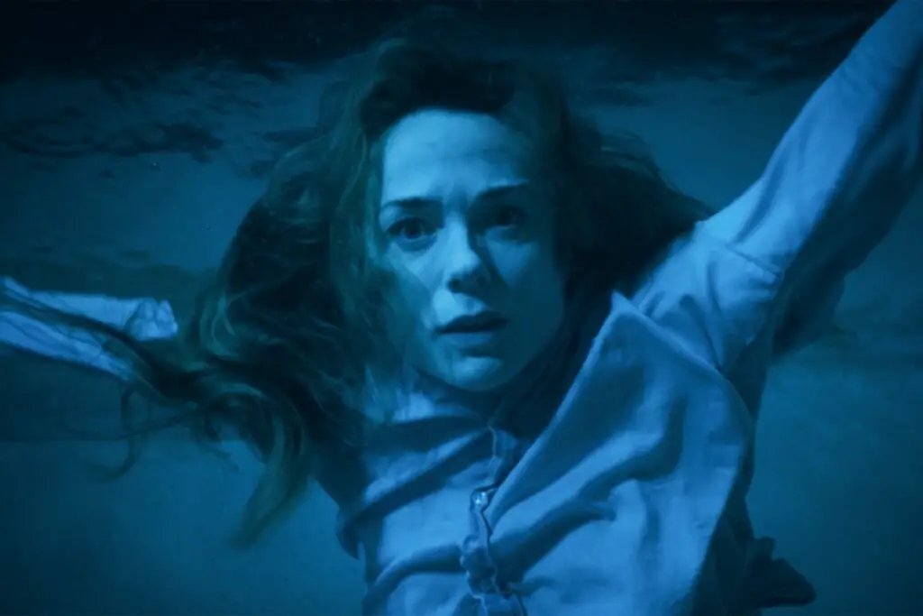 The next hour and a half of screen time oscillates between family scenes that give the impression that none of these characters have ever met before (Kerry Condon‘s shockingly committed presence, fresh off of an Oscar nomination no less, is just one of this pool’s mysteries) and swimming scenes, most of which aren’t set at night. The PG-13 rating unfortunately forces a slow burn structure onto what should have been an all-out slasher feeding frenzy; the mandatory pool party scene in particular promises more than it delivers. Nevertheless, in perhaps the film’s most commendable aspect, the filmmakers seem to have thought a lot about pool mechanics, somehow finding more and more new locations inside this small concrete rectangle to deploy for tension, creating surreal watery depths and shooting at creative angles even when the scenes themselves remain largely the same. Similarly, the film’s strategy for keeping the family coming back to the pool (a highly avoidable amenity no one actually has to use) is delightfully over-the-top: Ray is literally addicted to the pool.
