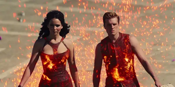 Did the film adaptation decide to go one step further with dismantling gender roles, or was the height difference incidental? It’s hard to say. Notably, however, Katniss and Peeta’s height difference is almost never perceptible in the film. Usually they appear about the same height, possibly due to intentional manipulation, for example, during the Tribute Parade in The Hunger Games: Catching Fire (2013). Maybe a discernible height difference would have been too much on top of Peeta’s penchant for baking, painting, and needing to be rescued.